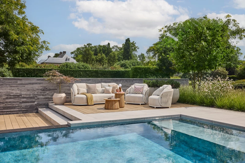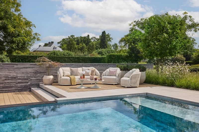 Bronz & Clouded lano & látka: Pebble Desert Bouclé: Bohatá kombinace, ve které bronzový rám dokonale ladí s čalouněním Clouded lana a Pebble Desert Bouclé.Teplá a luxusní volba pro atmosférickou terasu.