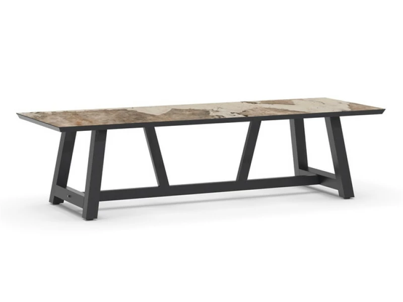 Zahradní jídelní stůl SUNS Ozon s deskou z teaku nebo Dekton® Khalo a hliníkovým rámem. Luxusní stůl pro 10 osob – design, odolnost a styl v jednom.