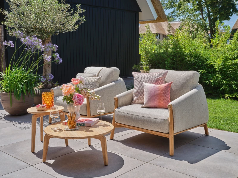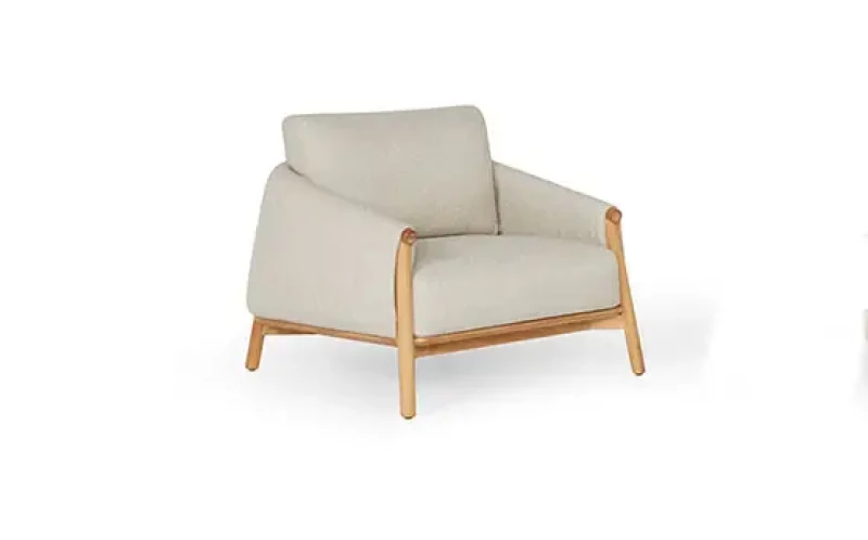 Elegantní design a kvalitní zpracování, křeslo SUNS Bellano z teaku s látkou Sunproof® Seashell bouclé nebo Natural gravel. Elegantní organický design, rychleschnoucí pěna Fast Dry Foam® a odolnost vůči povětrnostním vlivům pro celoroční venkovní komfort.