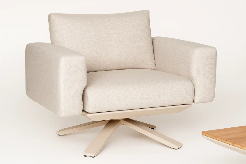 Luxusní zahradní křeslo SUNS STOCKHOLM z teaku a hliníku s čalouněním Fast Dry Foam a látkou Sunproof Olefin. Elegantní, pohodlné a odolné křeslo pro celoroční venkovní použití se zárukou 5 let.