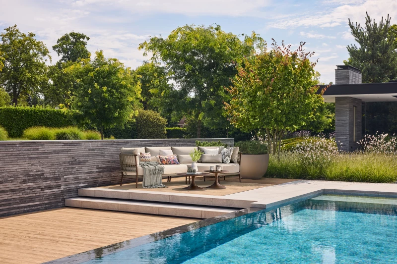 Pro relaxační zónu na terase nebo u bazénu jsou ideální lounge sety s hlubokým sedákem a měkkými polstry, které poskytují vysoký komfort sezení.
