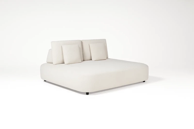 Luxusní zahradní postel SUNS Blocchi (180×215×89 cm) s organickým designem a španělskou outdoorovou tkaninou. Speciální povlak proti vlhkosti, minimální švy, ozdobné polštáře. Program YOU CREATE pro modulární sestavy.