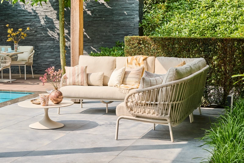 Souprava Tosca s rozměry 309,5 × 237 cm je ideální i pro menší venkovní plochy. Jemně skloněné sedáky zajišťují uvolněné sezení, zatímco velkorysé polštáře nabízejí mimořádný komfort. Elegantní rám s tkaným provazovým výpletem dodává soupravě jedinečné kouzlo inspirované romantickými designy.