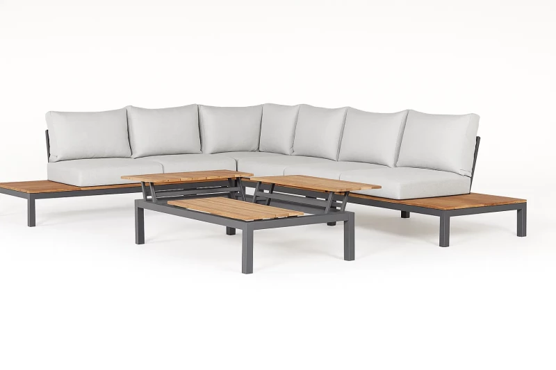 Zahradní rohová souprava SUNS Memphis II v barvách antracit/soft grey kombinuje hliník, teak a látku Sunproof®. Vodoodpudivé rychleschnoucí polštáře, výškově nastavitelný stolek, průmyslový design. Rozměry 337×267 cm. 5 let záruka.