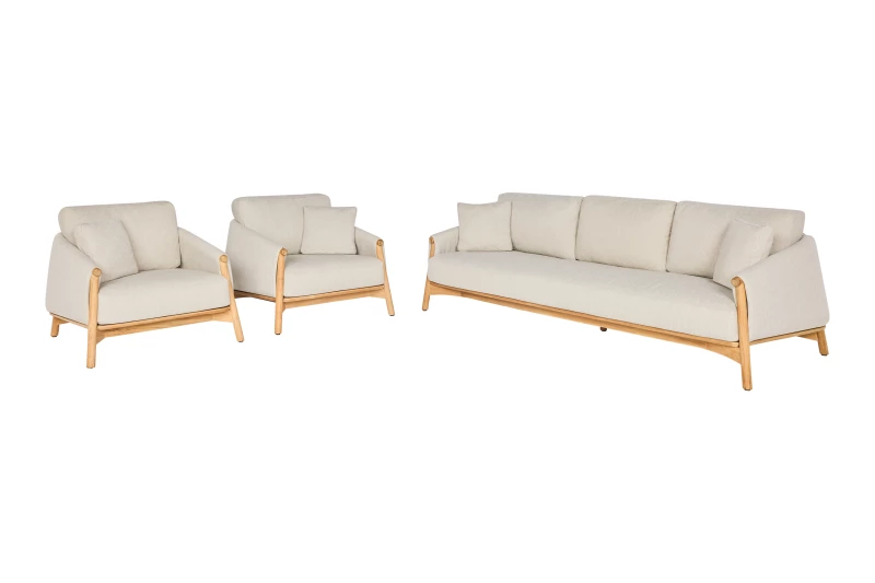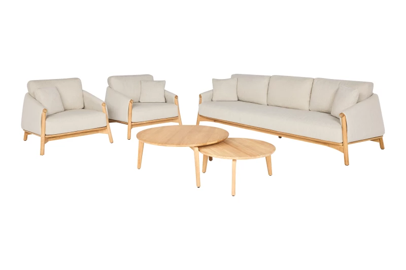 Luxusní zahradní sedací souprava SUNS Bellano z teaku s látkou Sunproof®. Elegantní organický design, rychleschnoucí pěna Fast Dry Foam® a odolnost vůči povětrnostním vlivům pro celoroční venkovní komfort.