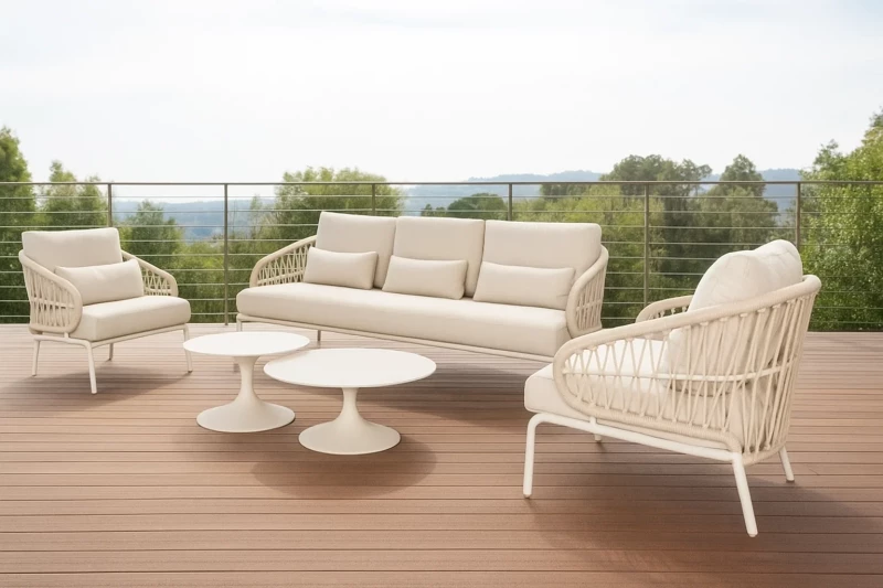 Štíhlý rám je potažen prémiovým provazovým výpletem v hravém tkaném vzoru, který dodává soupravě lehkost i charakter. Jemné přírodní barvy tvoří harmonický celek vhodný do každého exteriéru.