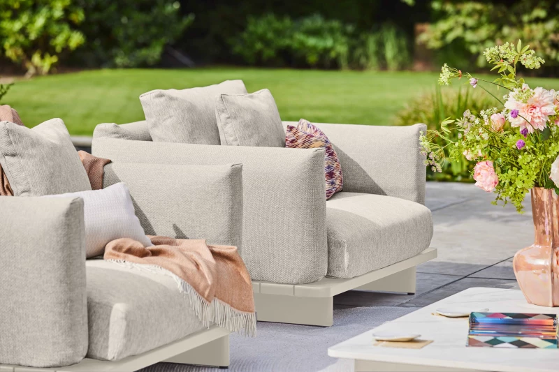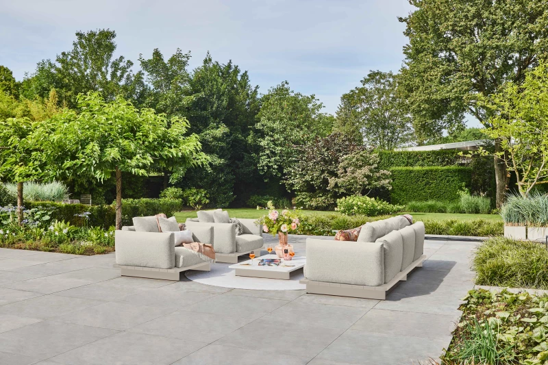 Luxusní sedací souprava SUNS Volar s hliníkovým rámem a Quick Dry Foam® polštáři. Sunproof® vodoodpudivá látka, Neolith® stolní desky. Program YOU CREATE pro modulární sestavy.