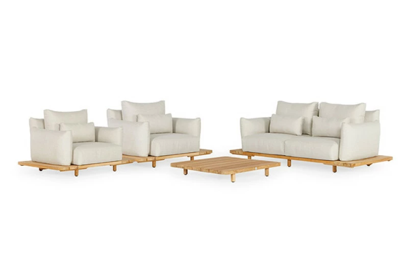 Luxusní zahradní set SUNS BORA soft grey z teaku s polštáři Sunproof a pěnou Fast Dry Foam®. Stylový design, odolnost a komfort pro moderní venkovní relax s tropickým nádechem.