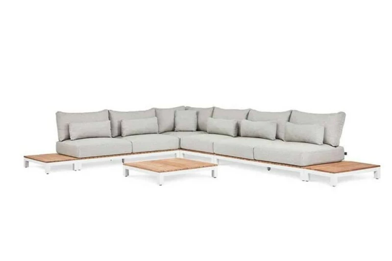 Luxusní zahradní souprava SUNS Evora II. představuje dokonalou rovnováhu mezi moderním designem, pohodlím a trvanlivostí. Vyrobená z prvotřídních materiálů, spojuje elegantní hliníkový rám, teakovou platformu a komfortní čalounění v nadčasovém stylu, který pozvedne vzhled každé zahrady či terasy.