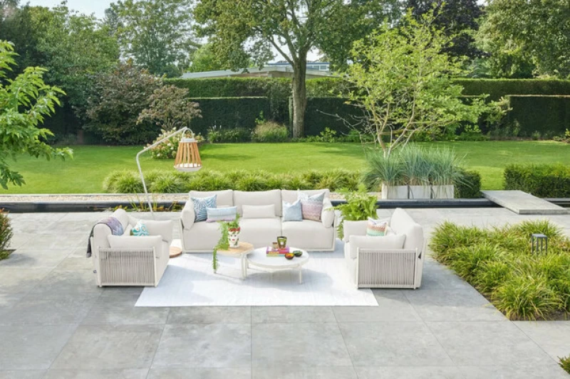 Kompletní sedací souprava SUNS Sorrento s 3-místnou sofou, 2 křesly a 2 stolky. Hliníkový rám s provazovým pletením, rychleschnoucí pěna a vodoodpudivá látka Sunproof® Olefin. Celoroční venkovní použití, bezprecedentní komfort. Dostupné další konfigurace.