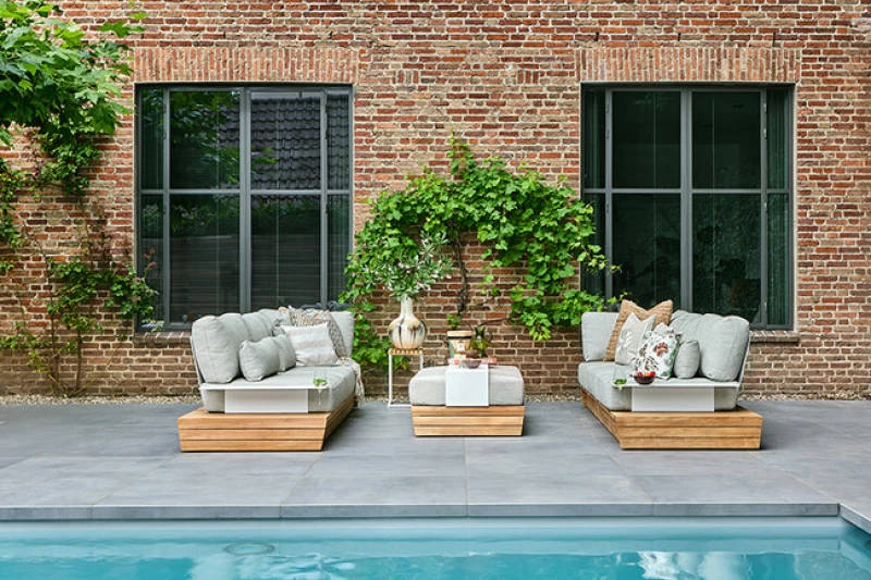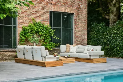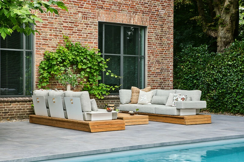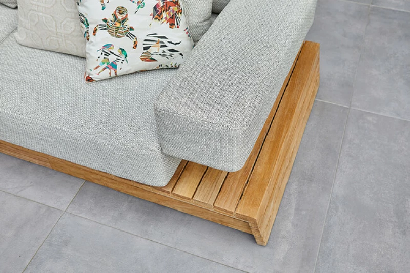 Platforma celé soupravy je vyrobena z přírodního teakového dřeva s mimořádnou životností. Tento tropický materiál je přirozeně odolný proti vlhkosti, UV záření i teplotním výkyvům. Postupem času získává teak elegantní stříbrošedý nádech, který podtrhuje jeho charakter a luxusní vzhled.