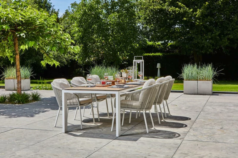 Luxusní teakový zahradní stůl SUNS Savona s hliníkovým rámem. Elegantní design, vysoká odolnost a snadná údržba. Dostupný ve dvou velikostech pro 6–10 osob. Ideální pro moderní venkovní stolování.