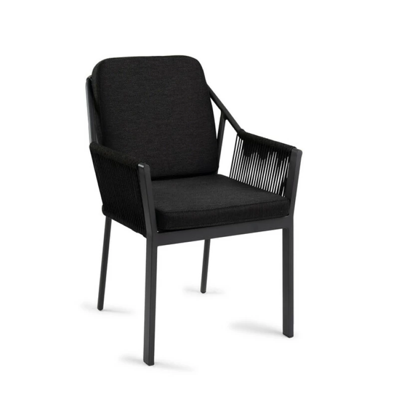 Rám židle je vyroben z odolného hliníku ošetřeného proti korozi, což zaručuje dlouhou životnost i při náročných venkovních podmínkách. Záda jsou ručně tkaná šňůrou z pevného a UV odolného materiálu, který dodává židli moderní a vzdušný vzhled.