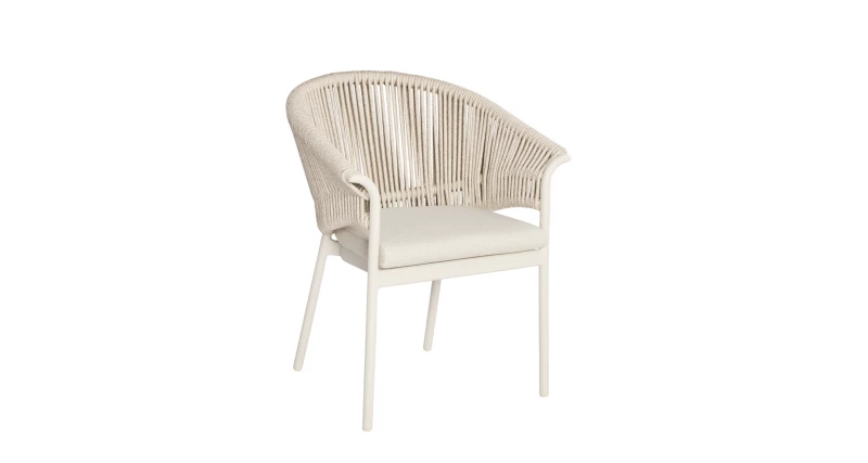 Elegantní zahradní židle Santorini z hliníku a lanového výpletu s odolnými polštáři. Stylová, pohodlná a vhodná pro celoroční použití. Ideální pro terasy, zahrady i balkony.