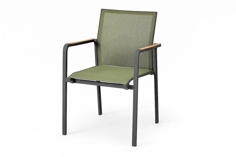 Zahradní židle SUNS Tutti v antracitu se zeleným textilenem a teakovými područkami nabízí lehkou hliníkovou konstrukci, moderní design a celoroční použití. Stohovatelná, odolná a skvěle kombinovatelná se stoly SUNS.
